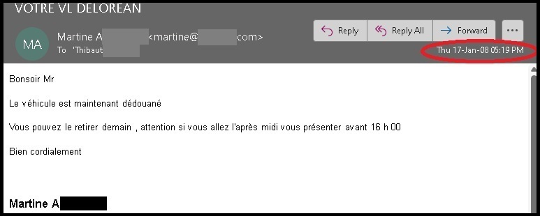 Elle : c'est la DeLorean nº5191. Moi : c'est Thibaut.
